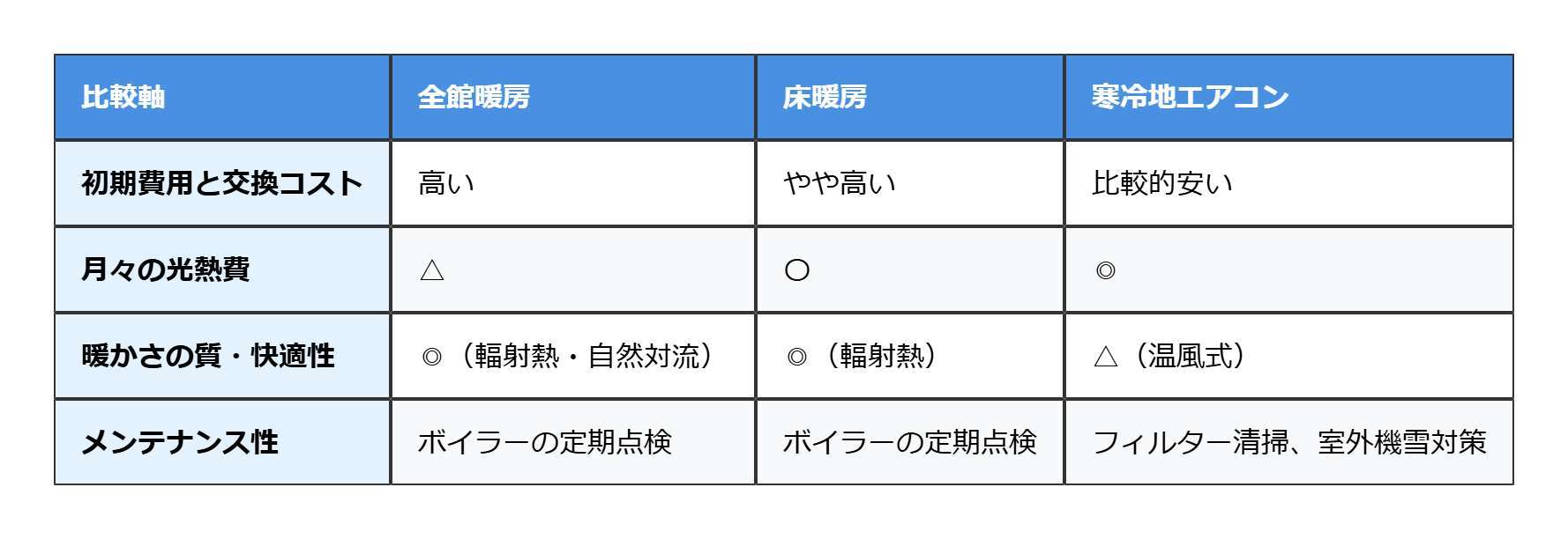 一般的に、初期費用は「エアコン < 床暖房 < 全館暖房」の順に高くなる傾向があります。また、10年~15年後にはボイラーやエアコン本体の交換時期が来ることも考慮に入れておく必要があります。